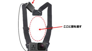 ネックマウントと思いきや、チェストマウントの肩ベルトだけを残した肩掛けマウント。給電は背面に回したモバイルバッテリーから行う。カメラとモバイルバッテリーのバランス(重量)によって、前方へ垂れ下がったり、後方へ引っ張られそうだけど、肩ベルトの...