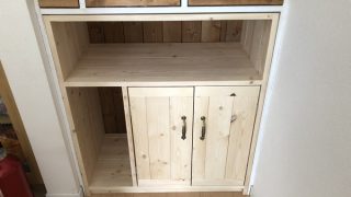 前回の続き。扉を作ります。1x4材を並べて板っぽくします。大きな一枚を作って、そいつを半分にしたら楽じゃね?って感じでやっていきます。▼こんな形に要らない部分はカット。▼こんな風にボンドなしで作る時は、クランプで固定したままビスを打ちます。...