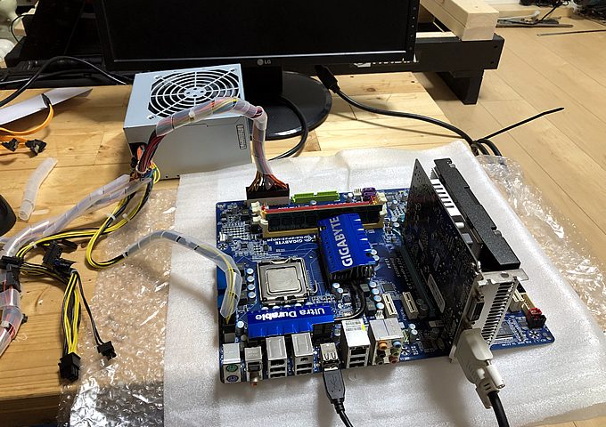 BIOS画面見るだけならCPUクーラー無くても大丈夫だろ~(軽視)と起動。久しぶりに拝むBIOS画面に見とれていると、20秒くらいで電源が落ちたのはいい思い出。