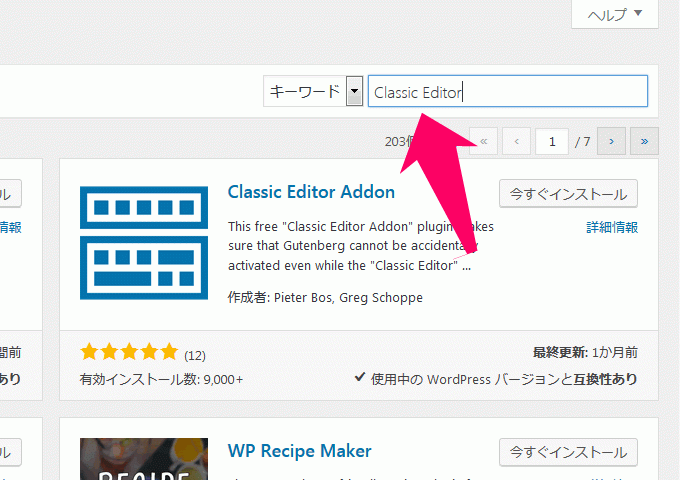 WordPress5.0のアップデート完了後に表示されるリンクからも「Classic Editor」をインストール出来ます。