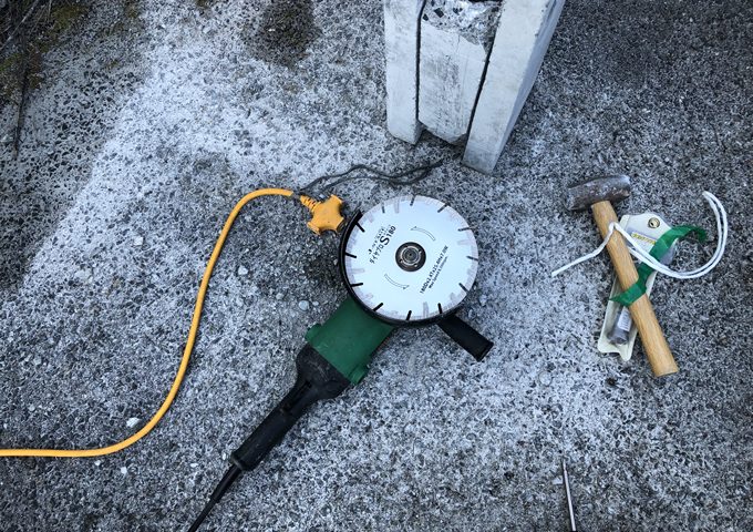ベビーサンダーよりパワフルでキックバックが怖い。ので、ある程度のところで溝切りをやめてハンマーで叩く。いままでの苦労は何だったんだ~ってくらい一瞬で終わった。180mmのサンダーいいね、欲しくなるw