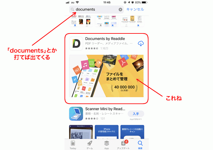 「Documents by Readdle(アプリ)」をDL、インストールする。「documents」とか打つとスグ出てくる。
