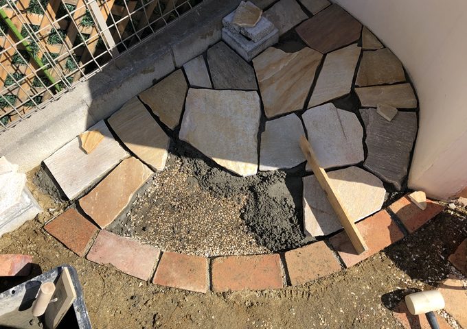 必要な石を最初に作って準備しておくやり方も、これはこれで良かった。けど、仮置きした場所と寸分違わずに再配置するのが難しく、どうしても目地幅がまちまちになってしまった。先割りも良し悪しだな。ただ、上でも書いたようにバサモルが扱いやすかったから、次は一枚一枚その都度作りながら固定していこうかな。