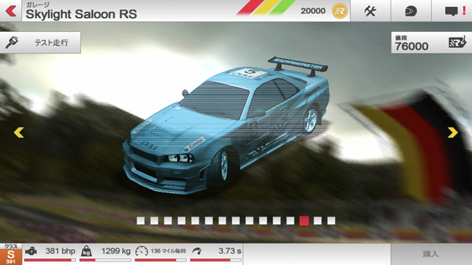 収録車種は15台。モデリングは概ね良好。車の名前やステッカー類は良い感じにフェイクっててニヤリ。ガレージで購入するとカラーになります。グラフィックは綺麗。FPS表示もあって、iPhone8だと60FPSで安定。