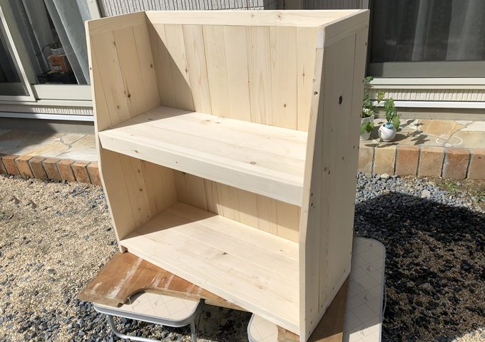 ランドセルラックを作る(1) DIY X Facebook はてブ LINE コピー 2019.04.292019.05.16 子供部屋に置く棚を作りました。ランドセルや教科書を置くのに使います。ランドセルの幅に合わせた仕切りを付ける予定でしたが、何も無い方が使いやすかった為、急遽デザインを変更。ものすごくシンプル。 サイズ:約800mm(幅)×約800mm(高さ)×約350mm(奥行き) 材料:1×4材(1820mmを15本くらい)、35mm、45mm、55mm(スリムビス) 時間の都合でラジオフライヤーの幕板加工は後日。 続く!