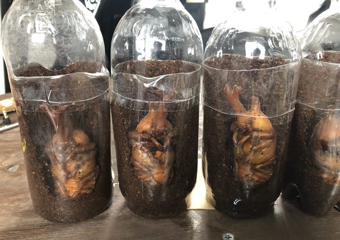 掘り出した6匹のカブトムシは、オスが5匹、メスが1匹。ほぼ全員薄茶色の蛹の状態でした。あと1ヶ月くらいで羽化でしょうか。頑張れー。