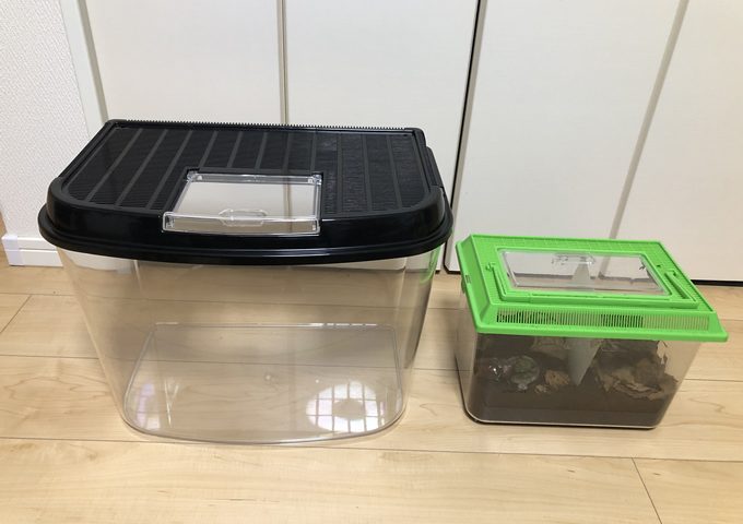 大きな飼育ケースを買い足しました。いままではダイソーにある一番大きなケースに仕切りを入れ、2部屋にしていたのですが・・・、ちょっと無理があったので大きいケースを買いました。今度のは大丈夫なはずw