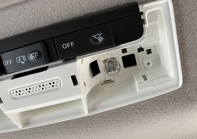 ▼ルームランプカバーを外します。4か所にツメがあります。破損しないようにゆっくり外しましょう。中央にあるカプセルのようなものがハロゲン球です。つまんで引っ張ると抜けます。