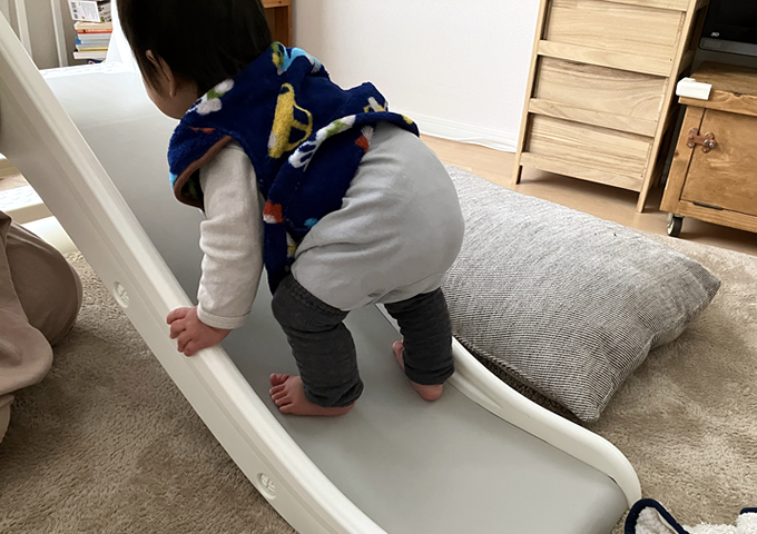 ホヤホヤの1歳児なので、逆から登って坂の途中で立ち往生します。ドヤ顔です。階段はまだ使えません。高いところから周りを見渡したり、下にあるものをのぞき込んだり、これはこれで刺激的です。もちろん見守りは必須。常に補助しています。シンプルなものほど奥が深い遊びができます。あれこれ考えるのも楽しいですよね!