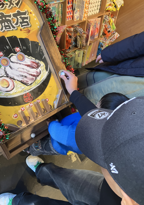 最後にスマートボール的なのをやらせてもらい、駄菓子をゲットする息子たち。