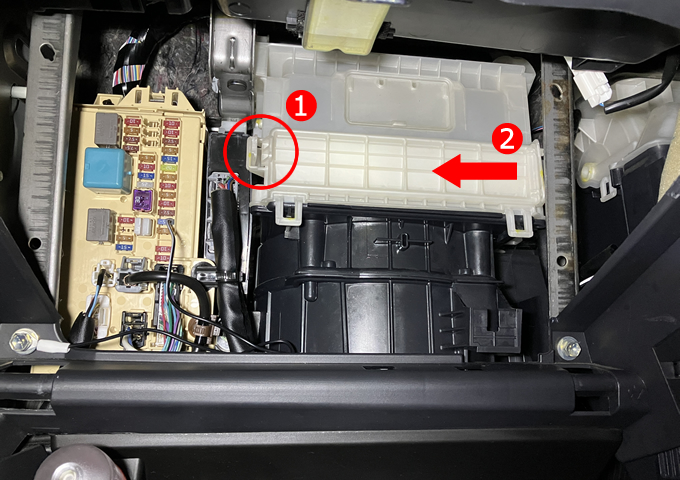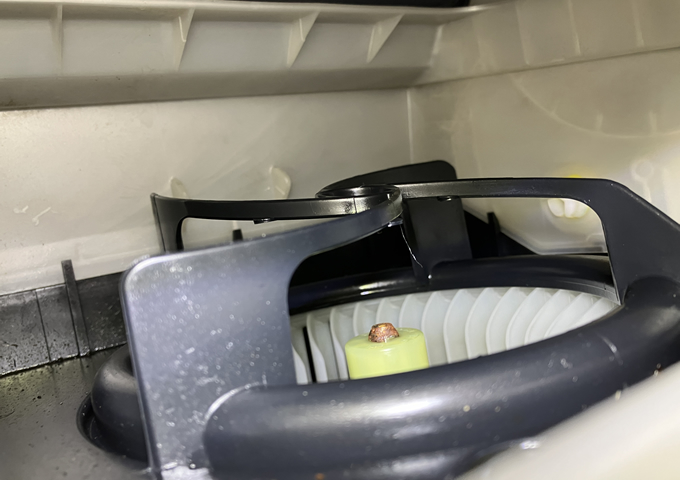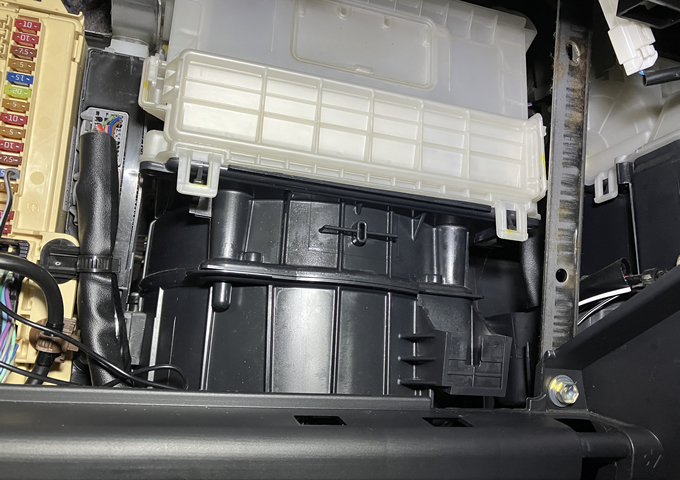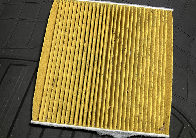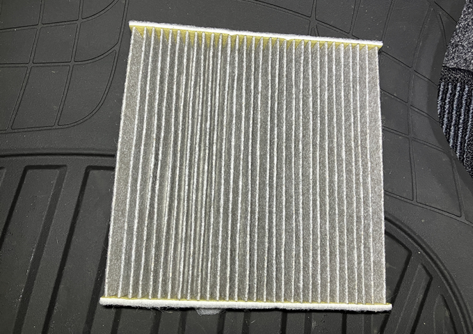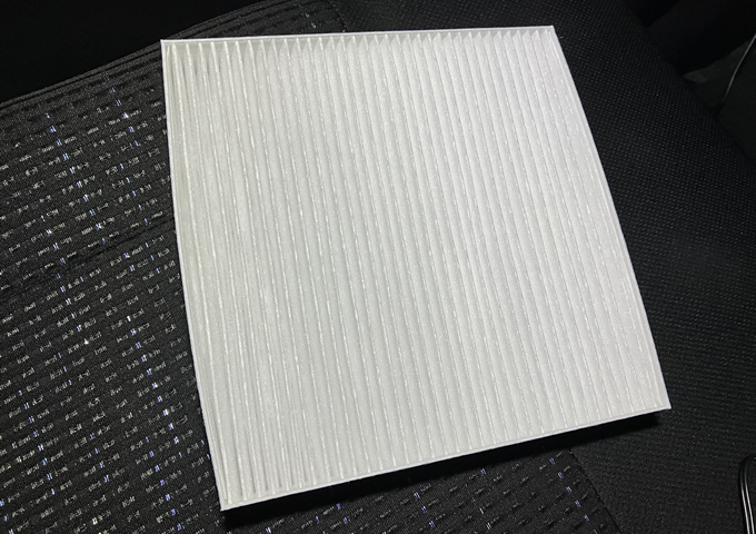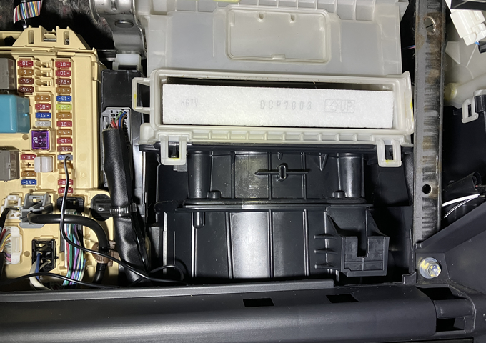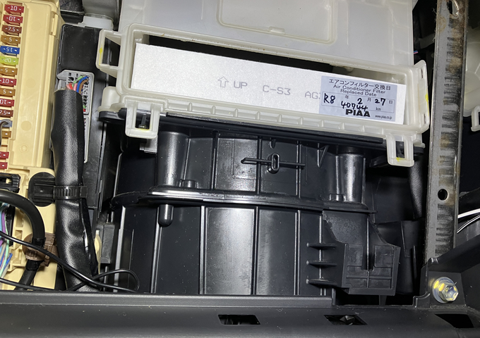 エアコンフィルターは、グローブボックスをズボッと抜き、奥にある白い蓋を外すと出てきます。前オーナーは純正?のを使っていたようです。自分はPIAAの汎用品を入れてみました。