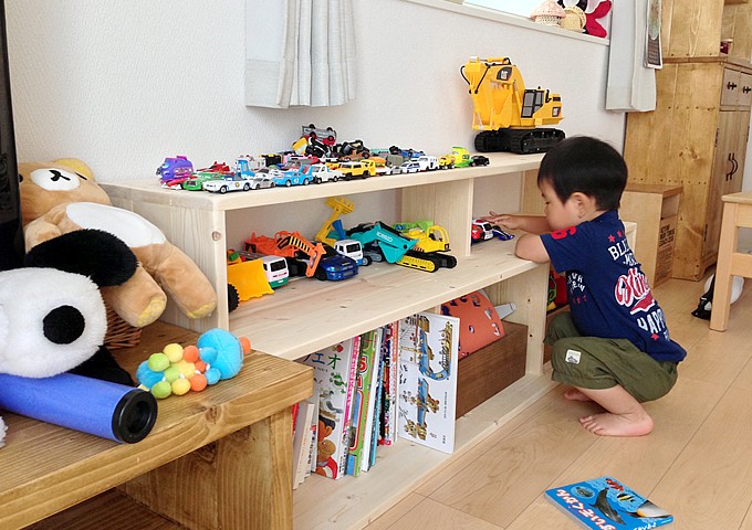 ▼トミカ棚はもう少し身長が伸びたら、かな?