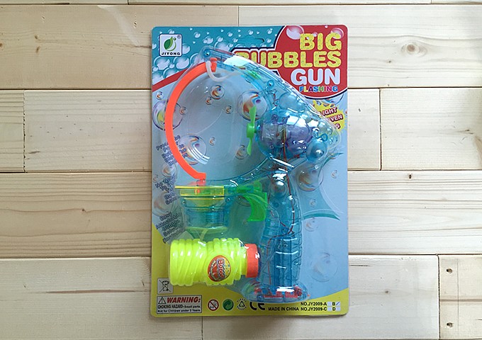 メガハウスのスーパーフルオートシャボンは10年も前に廃番か・・・と落胆している僕の前に現れたのがBIG BUBBLES GUNという電動シャボン玉マシーン(OEM商品が複数あるので正確な名称は不明)。ガンタイプの本品はスイッチを入れると同時に音と光の演出が始まり、電動タイプとしては珍しく大きなシャボン玉が作ることが出来る。トリガーを引いている時だけシャボン玉が作られる。