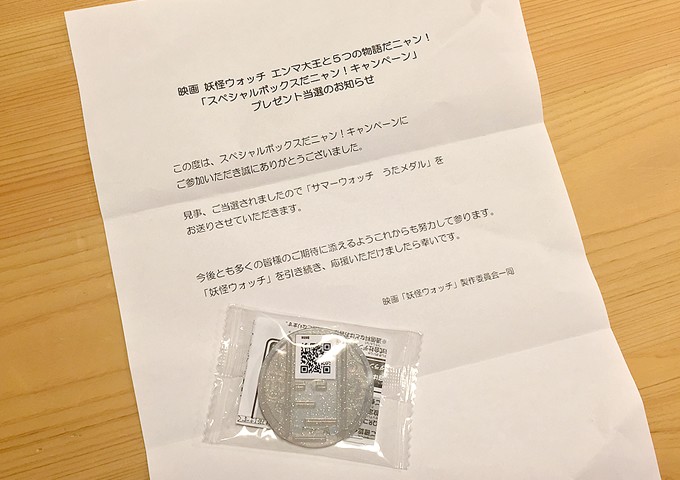 そうそう、コラボキャンペーン(Amazonと妖怪ウォッチ)の当選メダルが届きました。