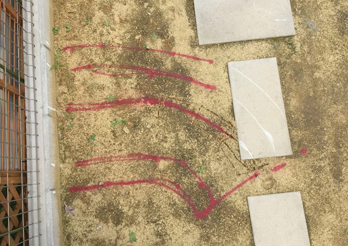 次に大きい方の基礎作りをします。掘るサイズを間違えないように、はなうたちゃんに線を書いてもらいました(^^;