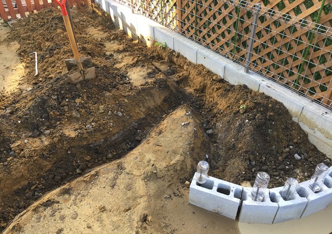 ミネくんの登場により電気系の問題が解消。というわけで置き土産のPF管(通線済み)を埋設します。上物で花壇や畑は作らないので深さは150mmくらいにしました。この次はいよいよブロック積みです(緊張)。