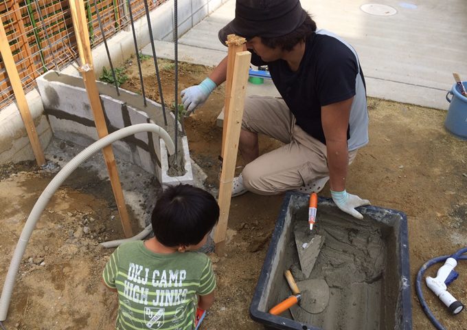 積む前のブロックは水をかけてから使いました。写真でみると乾燥しまくってるけど(^^;
