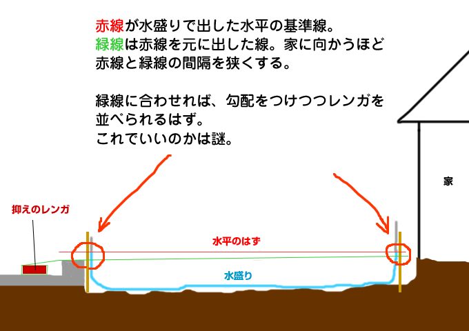駐車場側より玄関ポーチ側を高くするには?と、基準線の出し方を考えてみた。