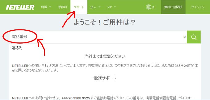 ▼メインメニューの「サポート」を選択して、キーワード「電話番号」で検索。