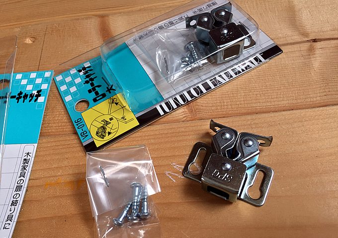 DIYというわけで、パカパカしちゃう板にローラーキャッチを付けてみた。金具の取り付けには当て木が必要だったけど(角度的に)、面倒なんでオスメス逆にした。