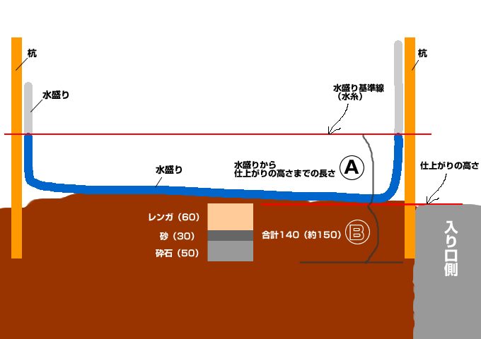 「水盛りの印に水糸を張ってAを出し、掘りたいBを足す。水糸からA+B分下がった所が路盤となる。」※転圧しすると下がるので注意する。