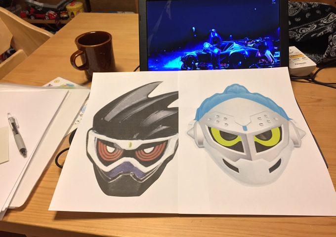 ゲンムとブレイブがお気に入りの息子は「お面を作ってほしい」「作ったら枕元に置いておいてね」と言って寝ました。ネットで画像を拾えばスグにできるかな?と思い、夜更かし開始。ところが・・・、