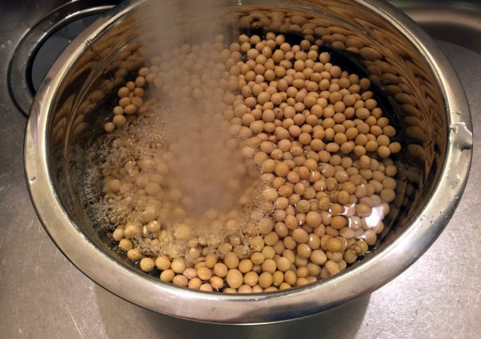 ▼大鍋に移して待ちます。水の量は豆の3倍にします。