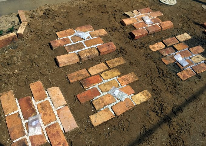土で?砂で?モルタルで?砂利で・・・?というわけで、先日作った土目地と砂目地のサンプルを踏まえ、改めて目地材を考え直すことにした。尚、はなうた先生の見解では、