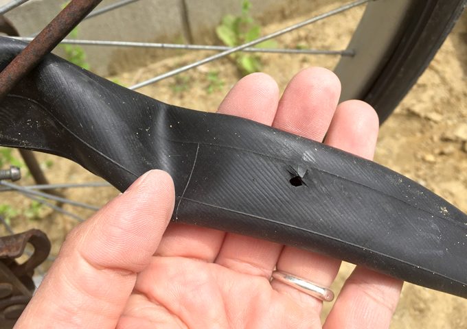 タイヤのトレッドをよく見ると大きなヒビ&割れが・・・、というわけでチューブになかなかの大穴が開いて自転車がパンク。
