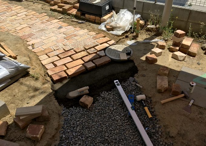 ジワ~っとしか進まないレンガ敷きですが(笑)、今回ついに雨水枡まで辿り着きました!レンガと枡蓋の高さに誤差も出ず一安心。残すは玄関ポーチまでとなりました。ここから先は低くさえならなければ良いので気楽かもです。尚、前回の課題だった砂の均しとレンガの叩きは結構気合を入れたので、雨が降ってもふわふわしないハズ。
