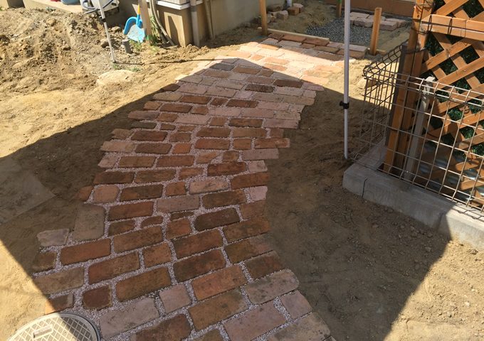 しっかり下地を作ったところに並べたレンガは安定感が違うね。