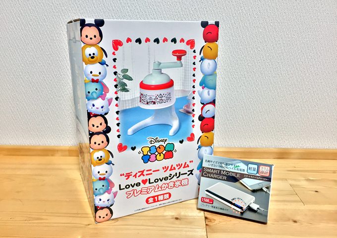 先日ゲットしたカーズのクッションに続き、最近どこでもキャッチャーと相性良さ気。というわけで、ツムツムのカキ氷機とコラボ品のモバイルバッテリーをゲット。イベント対象台だったみたいでセットで送られてきました。カキ氷機は息子が喜ぶな。シロップ買ってこないとだ。モバイルバッテリーはそれぞれのロゴが入ったノベルティですな。容量が1500mAhの薄型タイプ。ちょっとした持ち出に便利そう。感謝。