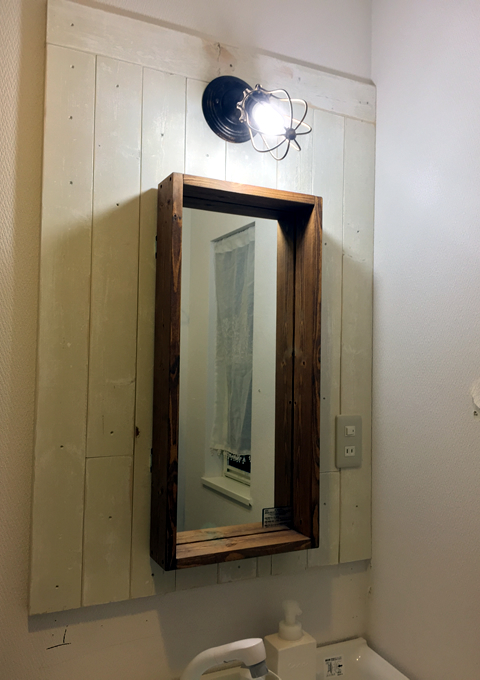 元々付いていた鏡は木枠タイプに作り変えました。小物を乗せられるように奥行きを持たせています。さて、吊下げ金具が手に入りましたので早速取り付けです。鏡+木枠で4キロ弱あったので吊下げ金具は4つ付けました(1個当たりの耐荷重1kg)。というわけで、久しぶりに洗面所に鏡が戻ってきました。