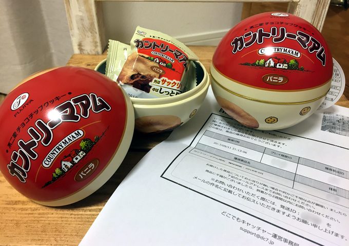 みんな大好きカントリーマアム!というわけで、どこでもキャッチャーの戦利品報告(久しぶり)。モンスターボールのような球型の缶にはカントリーマアムが4個だけ入ってました。アミューズメント専用と思われます。