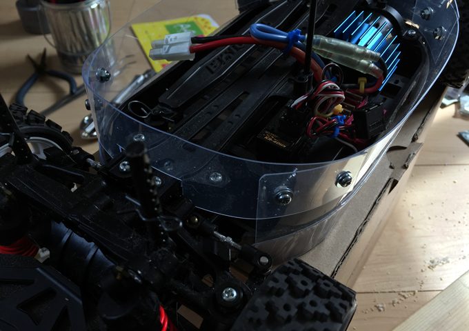 TT-01の防塵カバーを今一度作り直したって話です。今回はバッテリーやアンプスイッチにアクセスし易いよう上部を塞がない形にしました。数年前に思いつきで作ったブツは使い勝手が非常に悪くて棄てました(^^;。