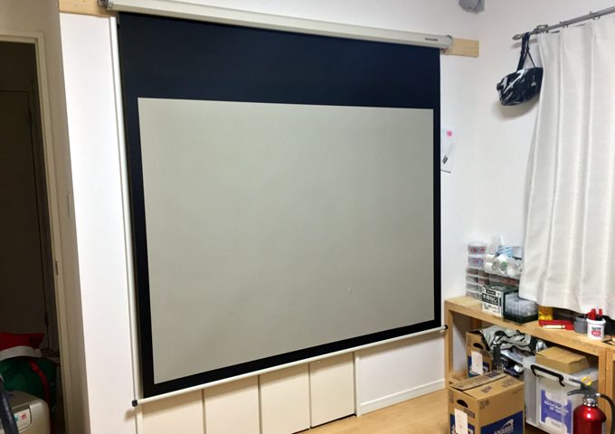 「消えないシミがあります。」という事で価格は3000円でした。スプリング巻上げ式の80インチスクリーンで、アス比が4:3だけど趣味で使うなら十分かなと。「100インチガー」とか「16:9ガー」とか変な欲は捨てて即買いしときましたw